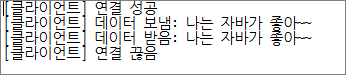 1234567891011121314151617181920212223242526272829303132333435363738394041424344454647public class EchoClient {public static void main(String[] args) {try {Socket socket = new Socket("localhost", 50001);System.out.println("[클라이언트] 연결 성공");// //데이터 송신// String sendMessage = "나는 자바가 좋아~~";// OutputStream os = socket.getOutputStream();// byte[] bytes = sendMessage.getBytes("UTF-8");// os.write(bytes);// os.flush();// System.out.println("[클라이언트] 데이터 보냄: " + sendMessage);//// //데이터 받기// InputStream is = socket.getInputStream();// bytes = new byte[1024];// int readByCount = is.read(bytes);// String receiveMessage = new String(bytes, 0, readByCount, "UTF-8");// System.out.println("[클라이언트] 데이터 받음: " + receiveMessage);//데이터 송신String sendMessage = "나는 자바가 좋아~~";DataOutputStream dos = new DataOutputStream(socket.getOutputStream());dos.writeUTF(sendMessage);dos.flush();System.out.println("[클라이언트] 데이터 보냄: " + sendMessage);//데이터 받기DataInputStream dis = new DataInputStream(socket.getInputStream());String receiveMessage = dis.readUTF();System.out.println("[클라이언트] 데이터 받음: " + receiveMessage);socket.close();System.out.println("[클라이언트] 연결 끊음");} catch (UnknownHostException e) {//IP 또는 도메인 표기 방법이 잘못되었을 경우System.out.println("UnknownHostException: " + e.toString());} catch (IOException e) {//IP 또는 Port 번호가 존재하지 않을 경우System.out.println("IOException: " + e.toString());}}}실행 결과